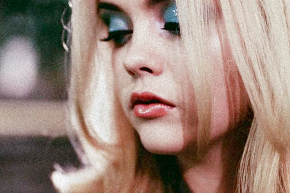 クリスティーナ・リッチの髪型、ブルーのアイシャドウ、オレンジのリップ。